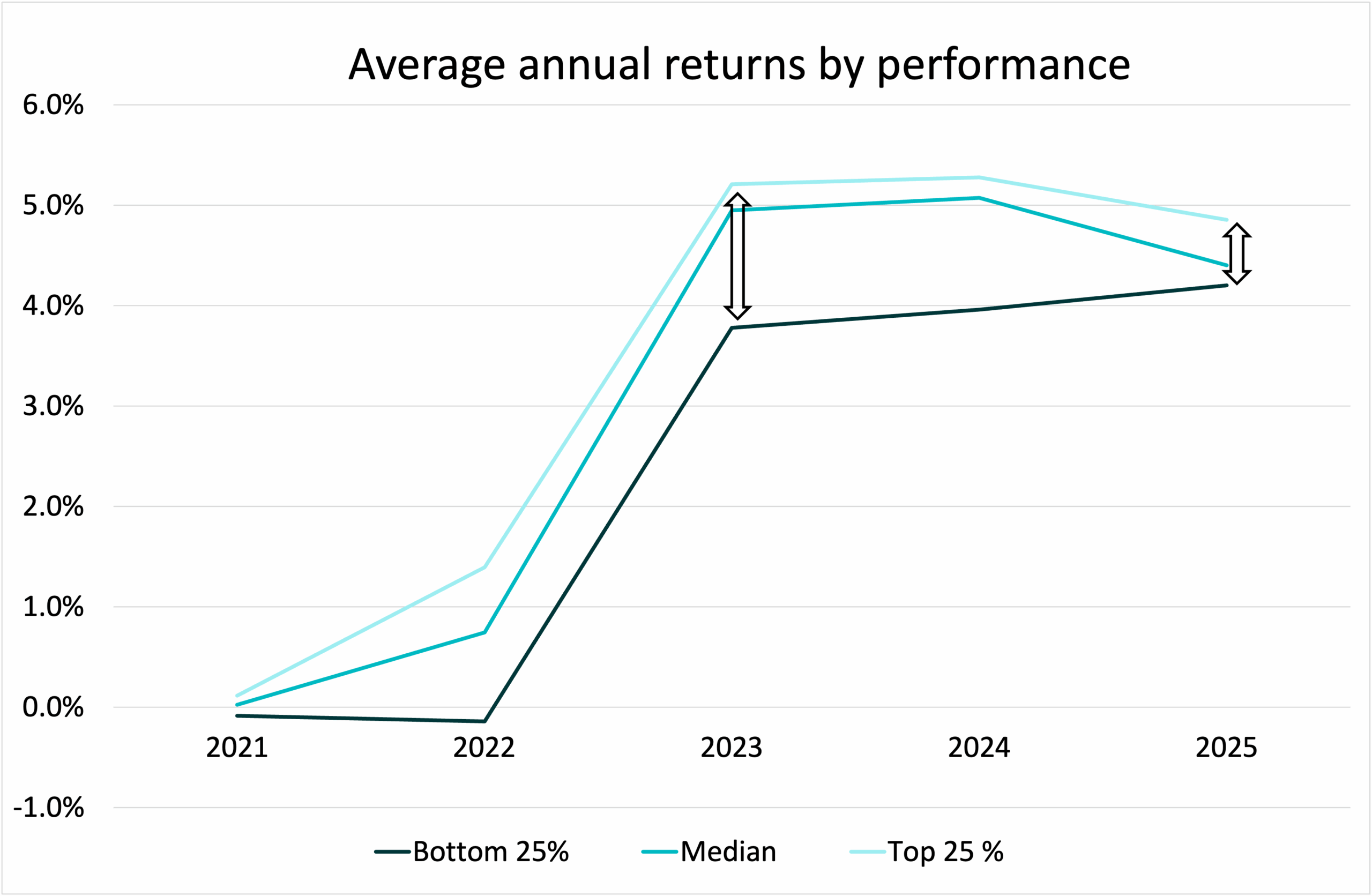 In 2021 all three groups had near zero yields. As rates rose, the fastest movers deployed cash into Treasuries and significantly outperformed many of their peers, hitting twice the median return in 2022. The following year saw a big leap in yields; followed by a compressing of returns in 2024 as rates held steady; then, a narrowing between the top and bottom groups as returns converged to the median.