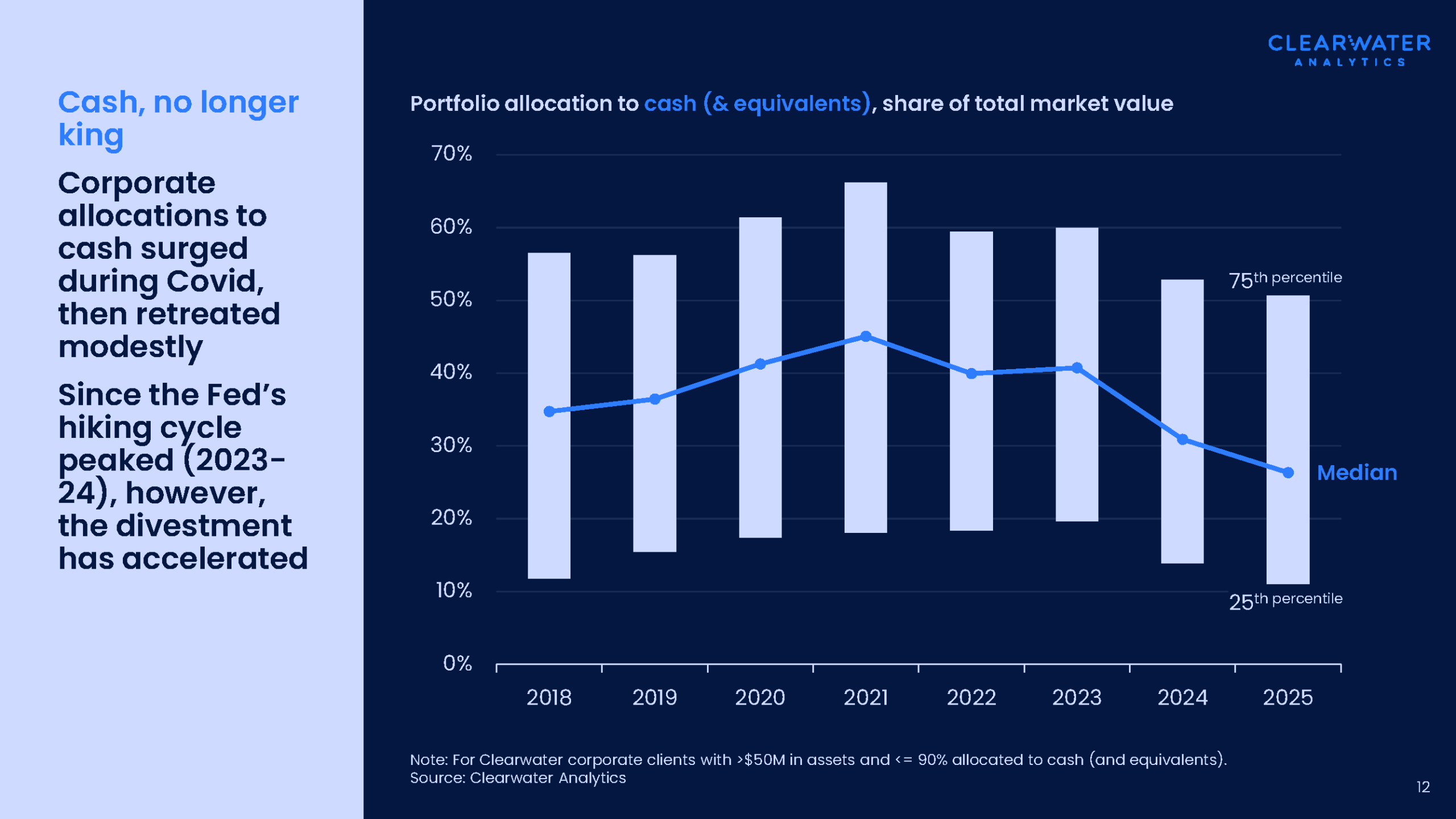 Median cash allocations reached a local peak of over 45% in 2021 in the wake of Covid, as the Fed held rates at the zero lower bound and corporates shied away from more aggressive strategies (see chart below). Today, as the Fed has cut, treasurers have shifted course: the median cash allocation of Clearwater’s corporate client base is now just 26%. While medians can be revealing, the larger bars point to the 25th-75th percentile ranges of our client base—corporates are hardly a monolith of strategy.