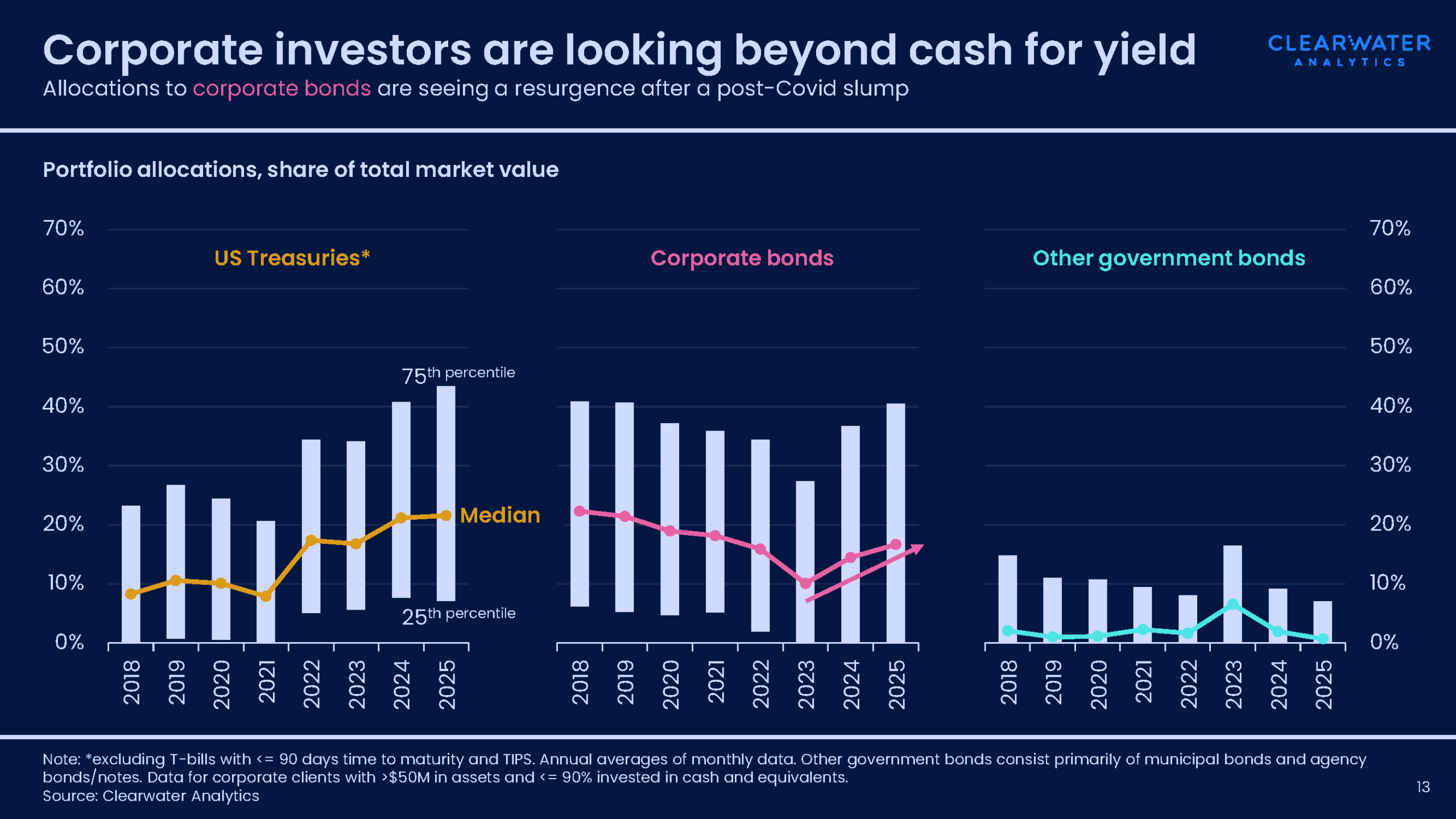 Figure 3: Corporate portfolio allocations to other than cash Note: Treasuries amount is excluding T-bills with less than 90 days’ time-to-maturity and TIPS. Annual averages of monthly data. Other government bonds consist primarily of municipal bonds and agency bonds/notes. Data is for corporate clients with more than $50M in assets and less 90% invested in cash and equivalents. Source: Clearwater Analytics